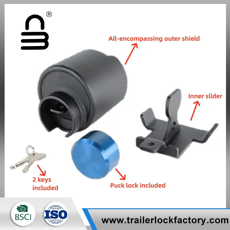 Phụ kiện rơ moóc khóa nắp bóng được làm từ thép cứng để bảo mật thêm, và vỏ bên ngoài ngăn các kẻ trộm sử dụng các công cụ điện, búa, máy cắt bu -lông hoặc Crowars trên khóa.